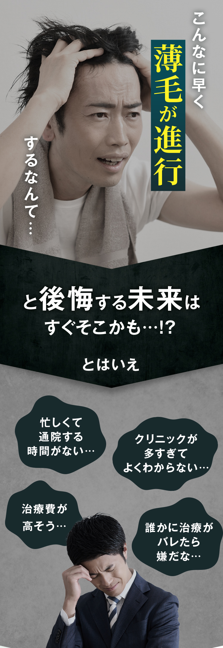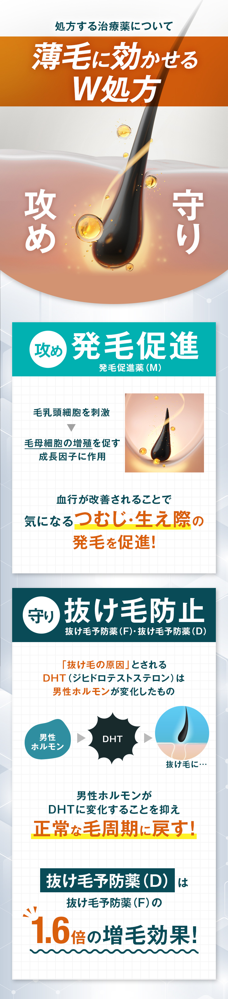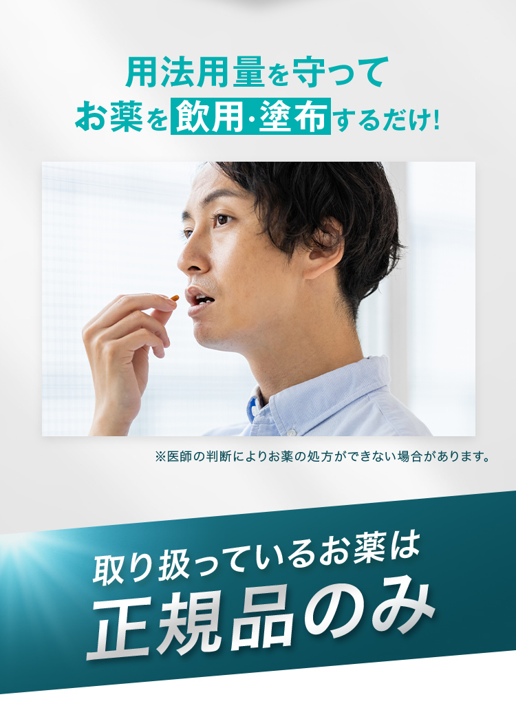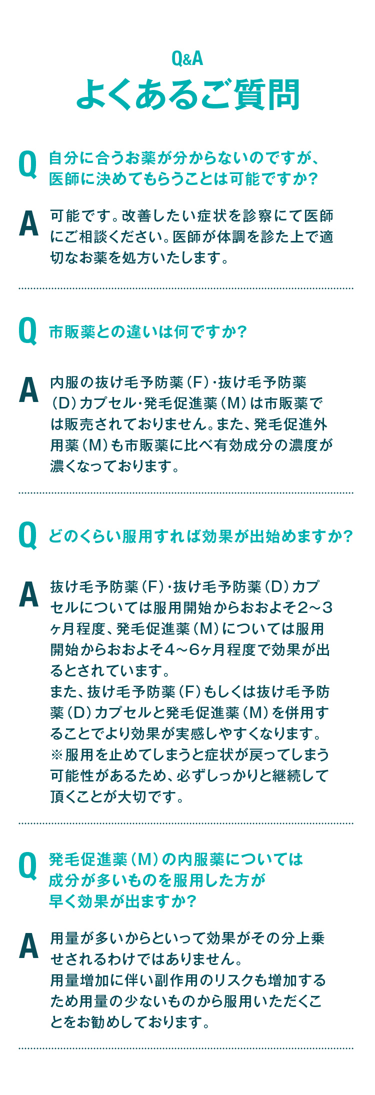 - 本診療科目に用いる発毛促進薬(M)は、頭皮に塗布する一般用医薬品として国内において承認されています。内服薬としては未承認の医薬品です。万が一重篤な副作用が出た場合は、国の医薬品副作用被害救済制度の対象外となります。