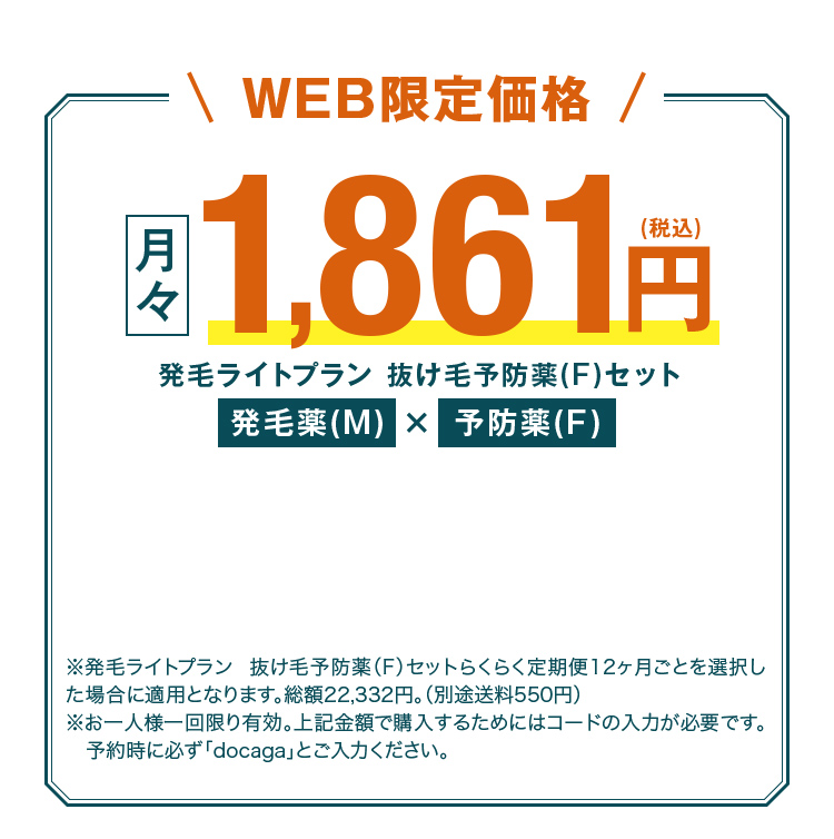 - 本診療科目に用いる海外製抜け毛予防薬(F)・海外製抜け毛予防薬(D)は、国内未承認の医薬品です。万が一重篤な副作用が出た場合は、国の医薬品副作用被害救済制度の対象外となります。