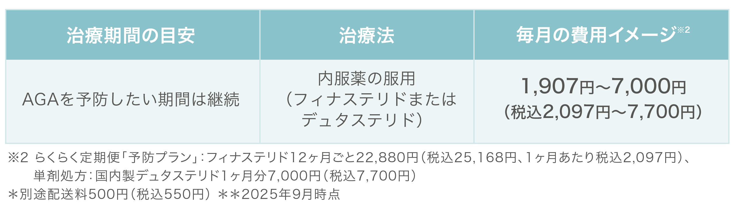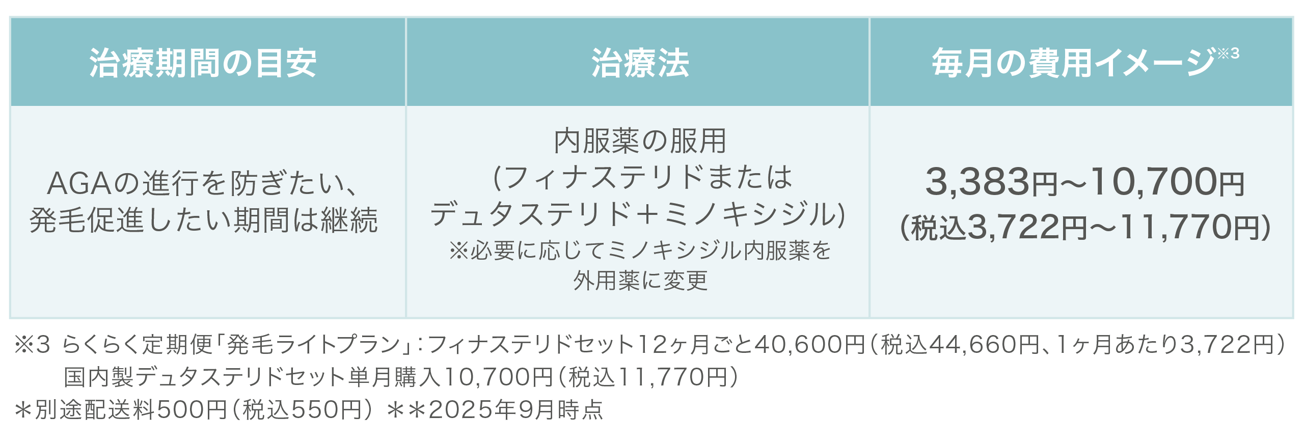 ※1 らくらく定期便「発毛ライトプラン」:フィナステリドセット12ヶ月ごと40,600円(税込44,660円)、国内製デュタステリドセット12ヶ月ごと65,000円(税込71,500円)。単月購入価格6,900円(税込7,590円)~10,700円(税込11,770円)。