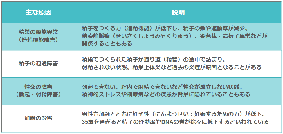 男性不妊の原因にはいくつかのタイプがあります。代表的なものを以下の表にまとめました。