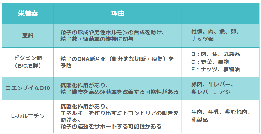 男性不妊の対策として、まずは栄養バランスのとれた食事を意識しましょう。精子形成などに必要な栄養素と主な働き、そして摂取できる食品の例を、以下の表にまとめます。