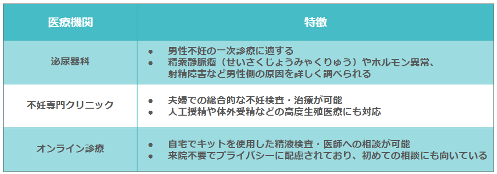 男性不妊の原因は多岐にわたるため、症状や目的に応じて医療機関を選ぶことが重要です。主に以下のような選択肢があります。