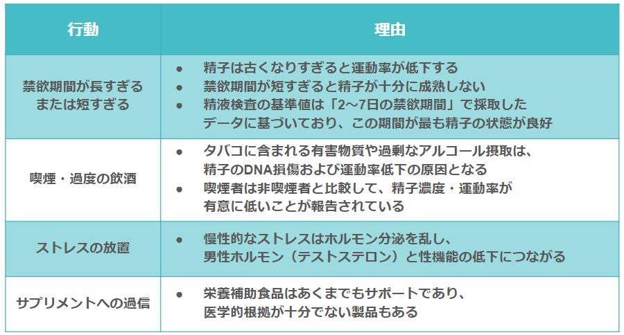 妊活中の男性が知らずに行いがちな行動の中には、精子の質を下げてしまうものがあります。ここでは、避けたい行動とその理由を表にまとめました。