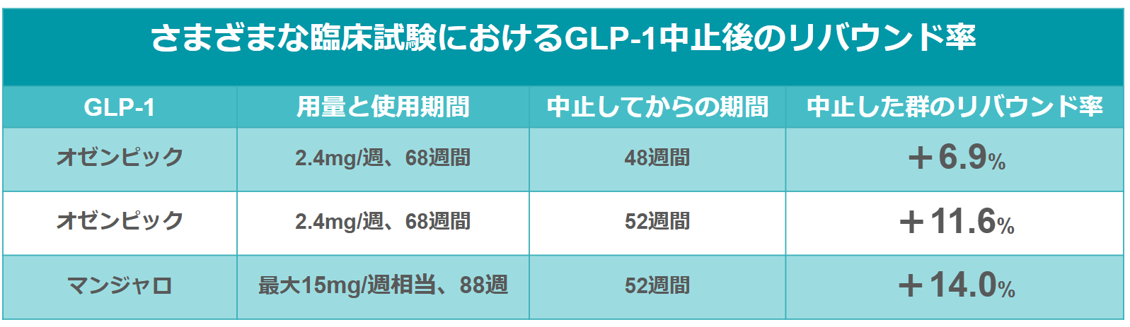 A.現時点では、マンジャロとオゼンピックのリバウンド率を直接比較した研究はありません。どちらの薬でも、治療をやめた後に体重が戻る傾向がみられる点は共通しています。