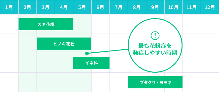 スギが2~4月、ヒノキが3~5月、イネが5~6月、ブタクサ・ヨモギが8~10月にそれぞれ飛散します。